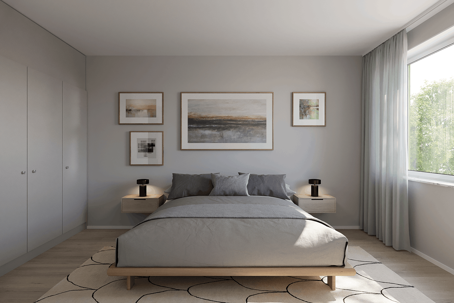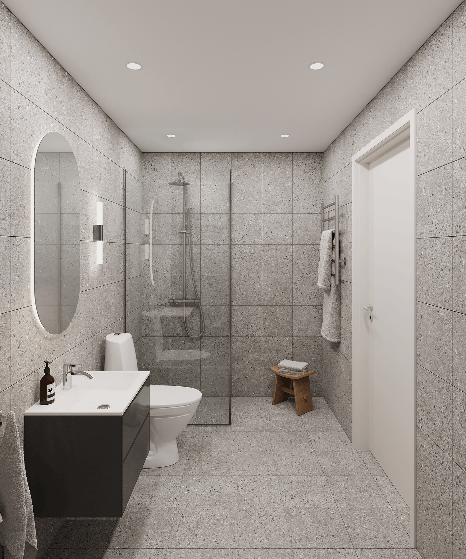 En genomgående 1-stavs ekparkett skapar en varm och sammanhållen bas i bostaden. Väggarna hålls i en ljusgrå kulörskala som reflekterar ljuset mjukt och förstärker rummens djup. Köken är integrerade i helheten med släta fronter, genomtänkt förvaring och tåliga bänkskivor. Vitvaror är diskret infällda för ett lugnt intryck. Badrummen präglas av granitkeramik på både väggar och golv, där funktion och estetik möts utan kompromiss. Golvvärme är integrerad i samtliga rum.