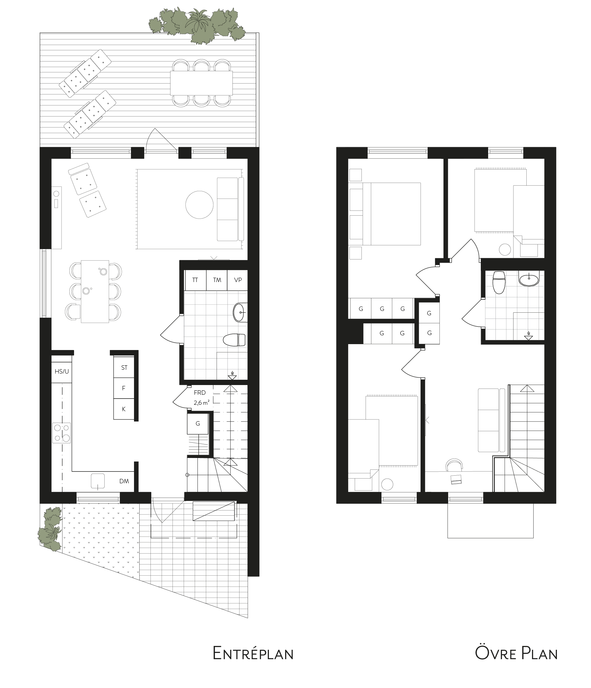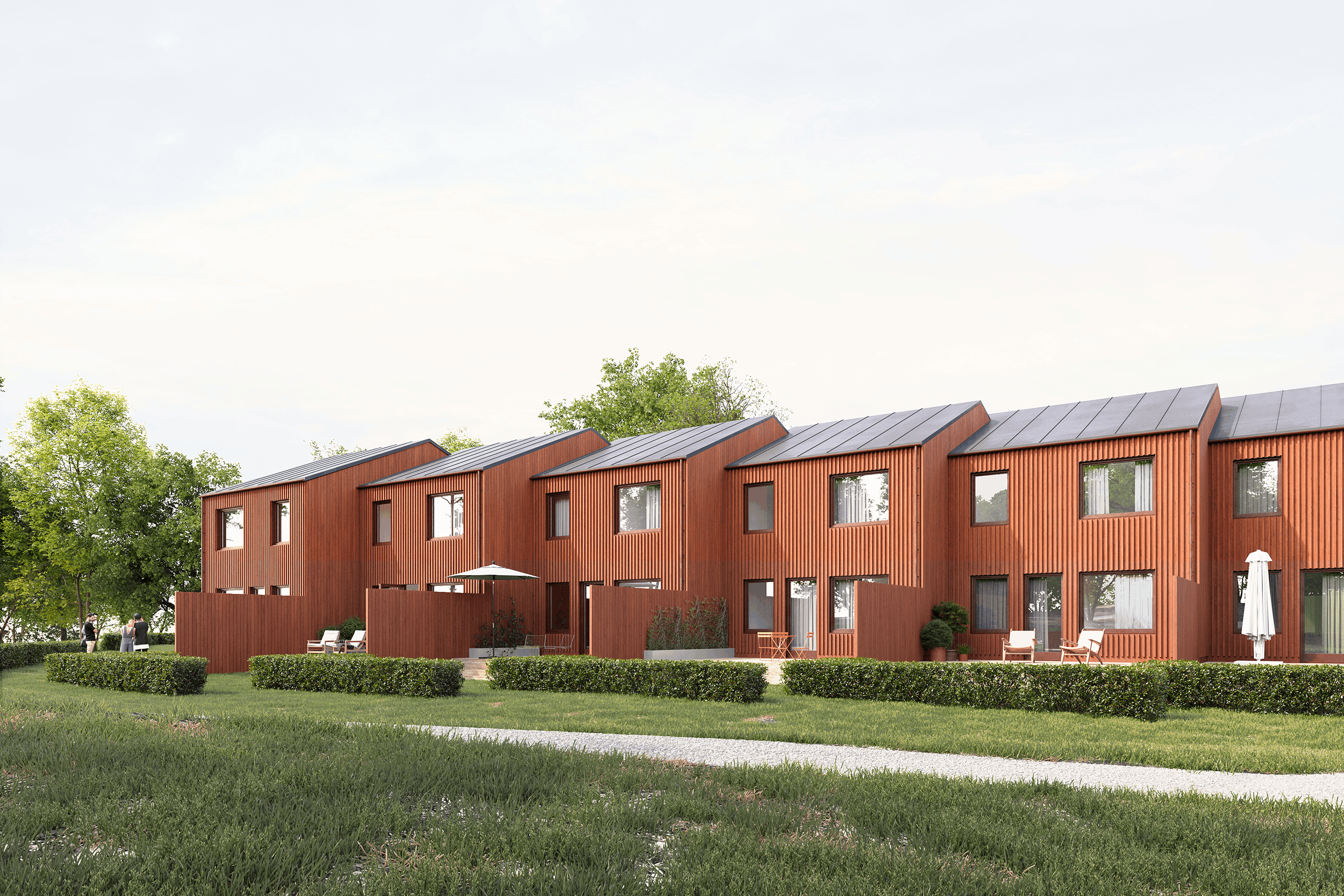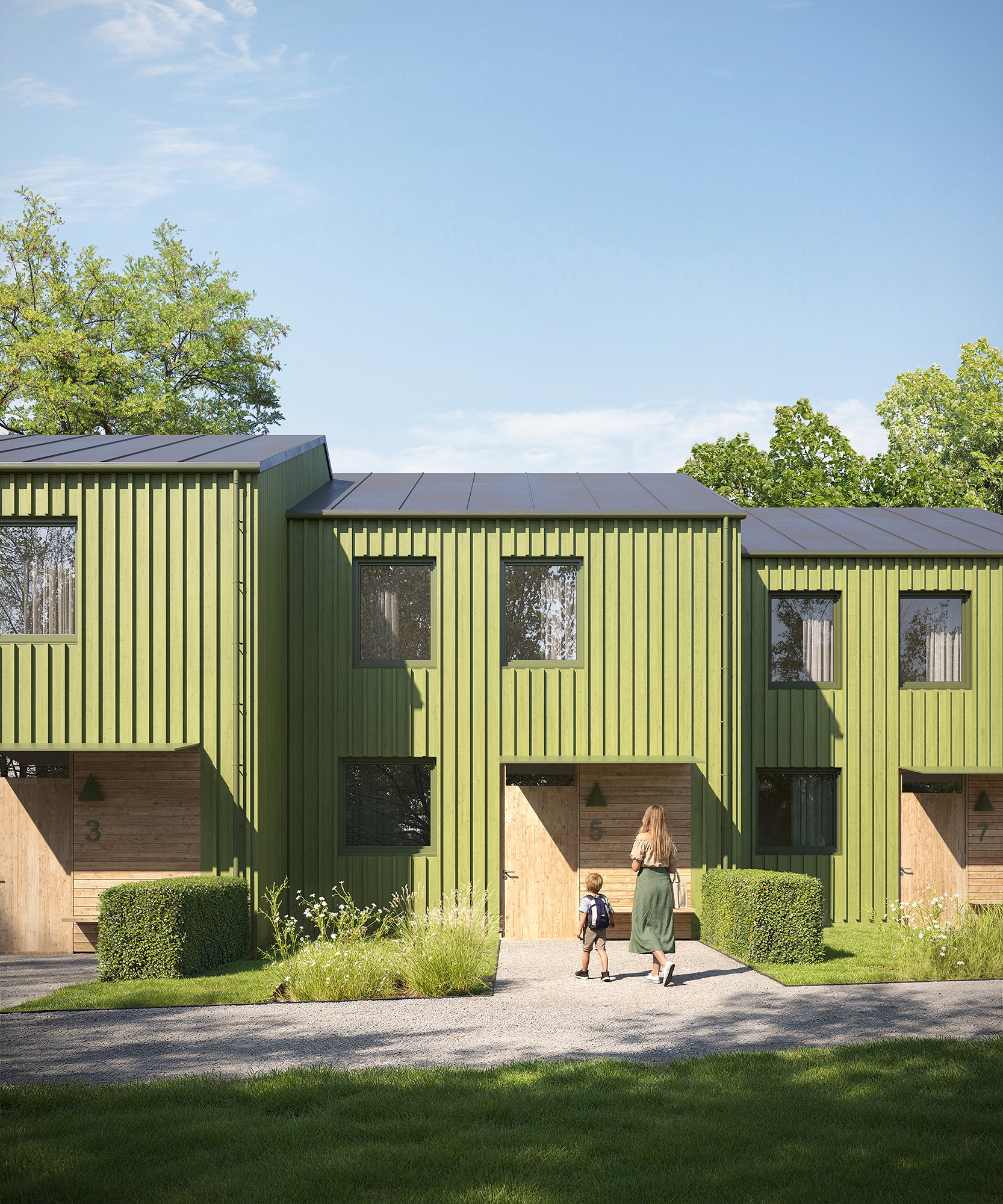 Projektet består av två radhuslängor där varje bostad är lätt förskjuten i förhållande till grannhuset, vilket skapar ett levande uttryck. Varje hem har sin egen terrass och en mindre trädgård, och vi har lagt stor vikt vid att skapa gemensamma ytor för lek och umgänge. Här finns även ett gemensamt växthus- en trivsam plats för samvaro även under kyliga kvällar.