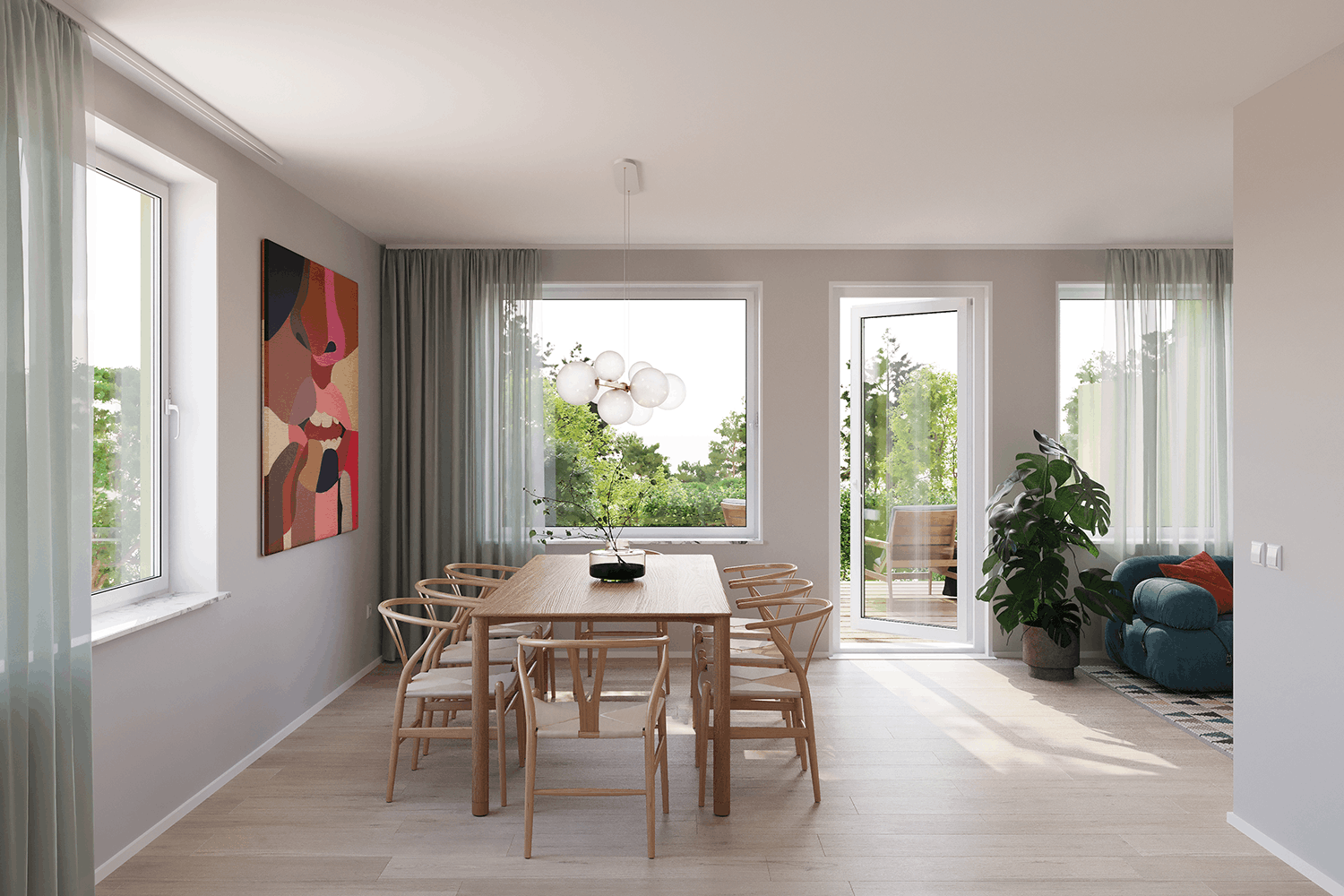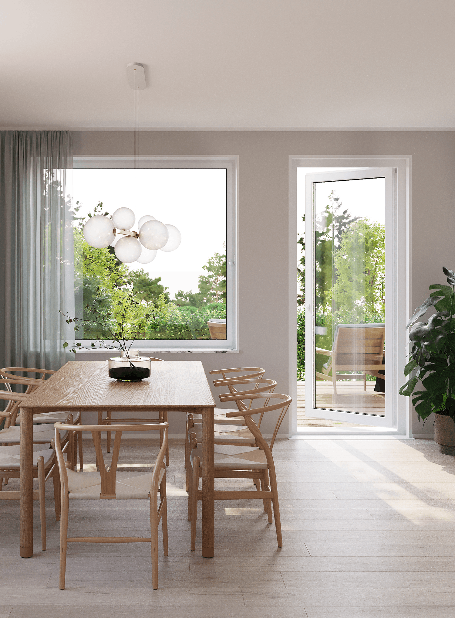 Exteriört är fasader och detaljer valda för att tåla det nordiska klimatet och samtidigt åldras vackert. Materialen är robusta, hållbara och långsiktigt ekonomiska. Detta är ett hem byggt för att kännas rätt från första dagen och fortsätta göra det över tid. Materialen är valda med samma omsorg som planlösningen – för att skapa ett boende med bestående arkitektoniskt värde.